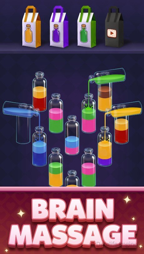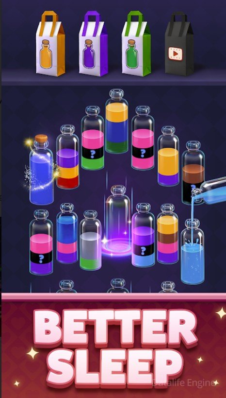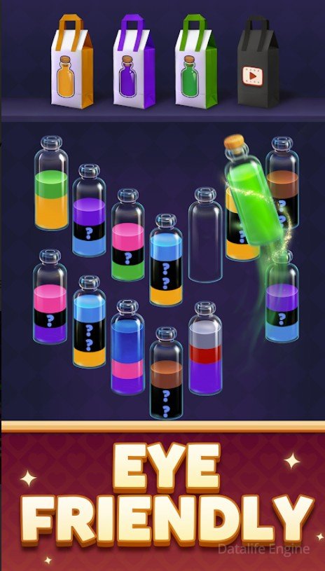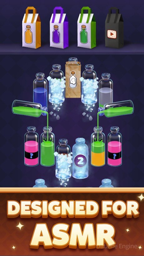 Water Match™- ASMR Water Sort (Mod бесплатные покупки) - спокойная игра – головоломка, позволяющая расслабиться в любом месте и в любое время. Простой и понятный механизм управления делает ее доступной даже для ребенка. Суть игры в том, что необходимо провести сортировку разноцветных жидкостей по соответствующих их цвету бутылкам. Среди дополнительных особенностей стоит выделить: