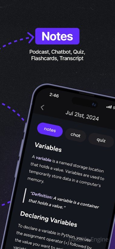 Turbo AI (Mod разблокировано) - многофункциональная платформа для учащихся ВУЗов на базе искусственного интеллекта, которая сделает процесс обучения в разы проще и интереснее. AI автоматически сгенерирует конспекты лекций на основе загруженных заметок, PDF-файлов и видео, дополнив их графиками, таблицами и диаграммами, и даже украсит их эмодзи. Также он умеет создавать заметки, решать уравнения, формировать карточки для повторения и вопросы для тестов, составлять отчеты, рабочие дневники и обрабатывать другую документацию. Для удобства использования AI разложит все материалы по папкам, а благодаря функции синхронизации можно использовать егона разных гаджетах. Обновляться они будут мгновенно. Еще одна способность утилиты создание подкастов для прослушивания коротких аудиофайлов, сгенерированных издлинных материалов. Установите ее и убедитесь, что это достойнаяальтернатива таким популярным среди студентов и профессионалов инструментам, как Mindgrash, Coconote, Study Fetch и Wave AI.