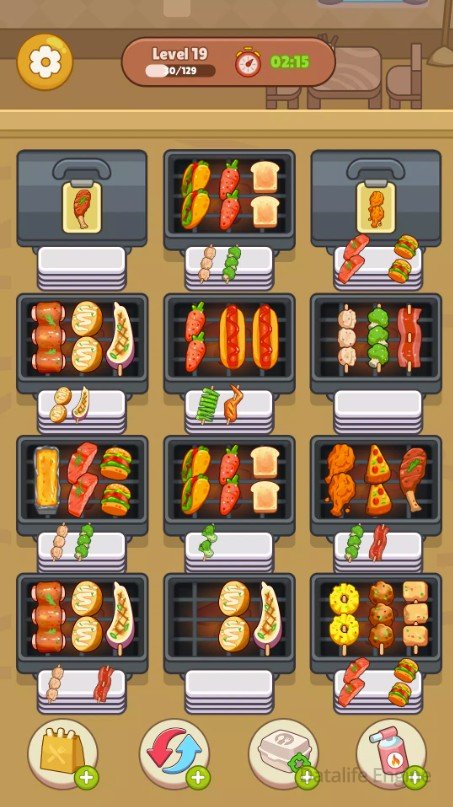 Foodie Sizzle (Mod бесплатные покупки) - новая головоломка для любителей все переставлять, смешивать, объединять и наводить порядок на полках. Если вы один из них, то эта кулинарная игра из серии «по три в ряд», то что вам нужно. Присоединяйтесь к симпатичным персонажам этой игры и начинайте работать на кухне, точнее нанизывать на шампуры и жарить на гриле мясо, морепродукты, овощи и другие продукты, которые хотели бы отведать клиенты. Делать все нужно очень быстро. Заказов много, а ваши возможности ограничены размерами гриля. Постарайтесь уместить на нем как можно больше шампуров. От этого зависит успех всего вашего предприятия. Будьте внимательны, ведь время от времени вас будут отвлекать от работы вечно спешащие курьеры, приезжающие в ваш ресторан с особыми заказами. Следите за тем, чтобы место на гриле не заканчивалось. Кроме того, вы ограничены по времени. Напрягитесь, не упустите ни одного клиента. Решайте головоломки и мастерски управляйте грилем легкими движениями пальцев.
