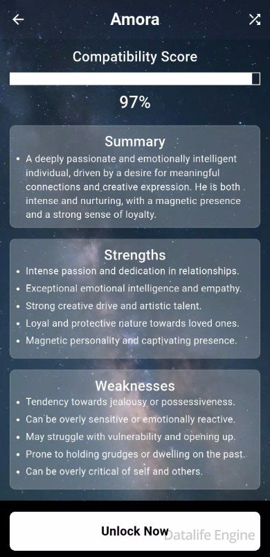 Amora (Mod разблокировано) - популярное приложение для Android, котороепоможет вам представить, какой будет ваша родственная душа, совместимы вы или нет со своим избранником или другом, и что думают звезды о вашем союзе. Оно не просто проанализирует ваши отношения, а и визуализирует вашу «родственную душу» в виде скетча, созданного на основе астрологического профиля. Для этого используются древние знания астрологии и современные технологии искусственного интеллекта. В частности, для определения рейтинга совместимости достаточно просто загрузить фото «пары». Результаты совместимости и история скетчей сохраняется, что позволяет контролировать это «космическое» путешествие для двоих. Также утилита предоставляет пользователям ежедневные гороскопы и определяет персональное счастливое число. Присоединяйтесь к более чем одному миллиону его пользователей и спланируйте свое будущее. Найдите свою космическую пару и ведите интеллектуальные беседы, романтические диалоги, обменивайтесь мыслями на разные темы и просто интересно проводите время.