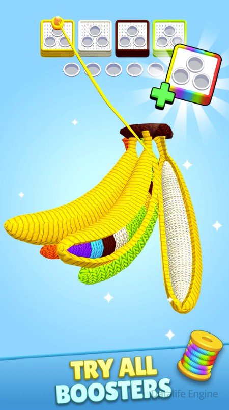 - Наличие бустеров местами сильно помогает облегчить прохождение: сложность постепенно возрастает и, порой, не понятно с какого места начинать или как продолжить «тянуть нитку», чтобы собрать клубок нужного цвета. В таком случае бустер будет очень кстати.