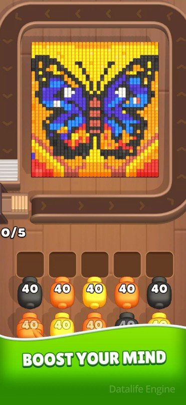 - Множество уровней разной сложности: от простых до очень сложных. И каждый из них имеет свою картину – рабочее поле, которую необходимо «разобрать», чтобы пройти дальше.